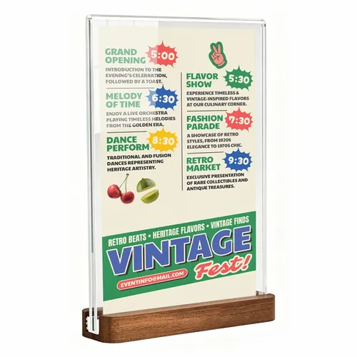 Sapele Wood Desktop Display is a practical and versatile tool used to showcase signs, labels, or other informational materials on a desk or tabletop surface. The base is made of Sapele wood with an A4 size acrylic top. Customers can choose whether to add a customized inner page. The inner page is A4 size and can be fully printed with colorful background and logo.