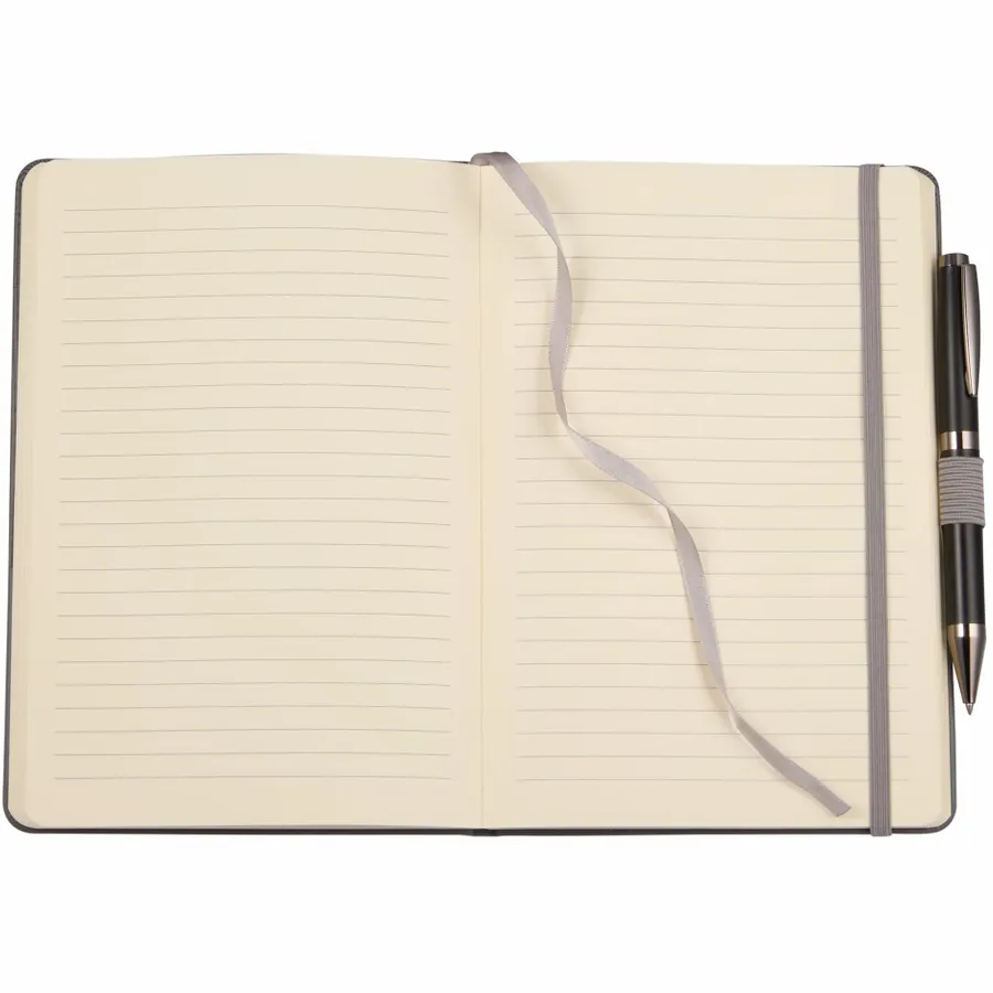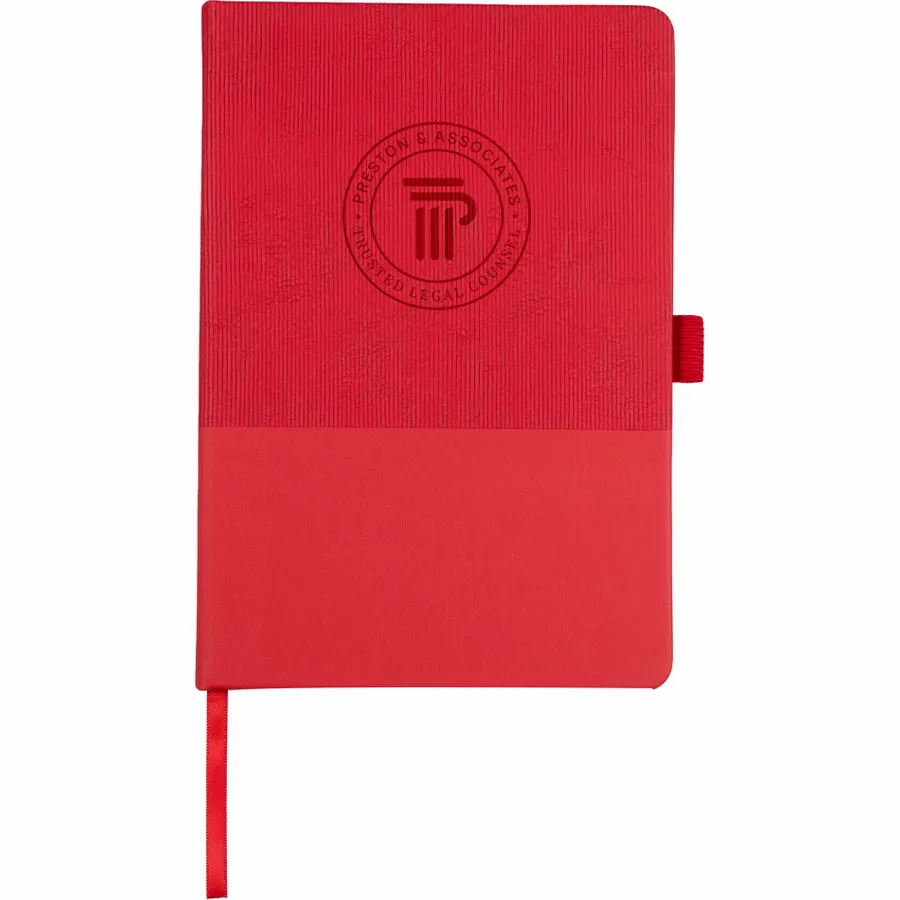 The 5.5 x 8.5 FSC Recycled Ribbed Bound Journal combines sustainable materials with a stylish design, featuring a hardbound cover made from 30% recycled post consumer polyester and polyurethane with a unique ribbed texture. This journal includes 80 sheets of FSC recycled, perforated paper, along with a color-matching ribbon page marker, elastic pen loop, and secure elastic closure. The inside back document pocket offers additional storage, while the JournalBooks logo embossed on the back adds a subtle touch of branding. Pen is not included. By choosing this notebook, you’re making a positive impact on the environment through a partnership with 1% For The Planet, as a portion of each sale supports environmental nonprofits.